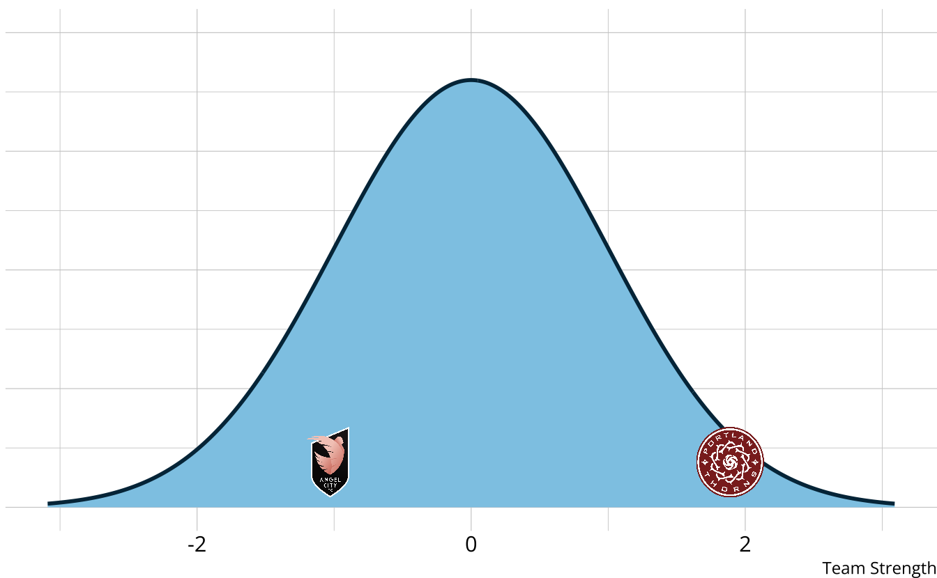 A normal distribution with team logos from the National Women's Soccer League overlayed.